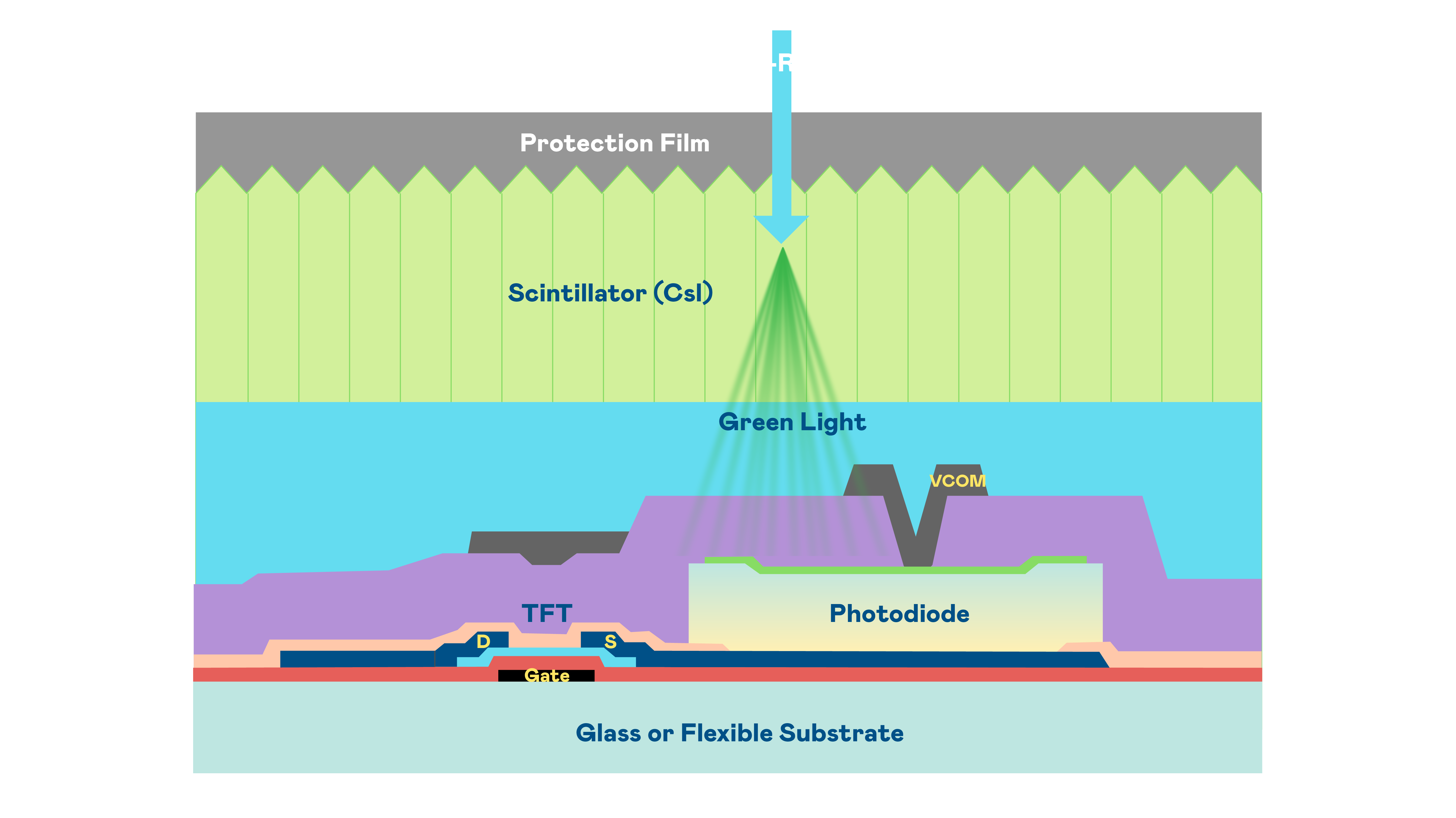 人生就是博的X光影像感測陣列使用薄膜電晶體 (TFT) 作為每個像素的讀取開關,搭配光電二極體(Photodiode)的光電轉換元件,用以感測X光影像訊號。
